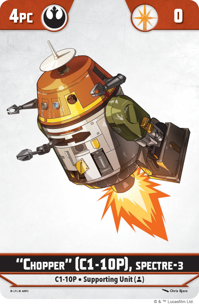 Copyright AMGStar Wars has some really cool droids, and Chopper has to rank near the top. Chopper is the support unit in this squad, and has a cost of 4. Chopper also has 8 Stamina and 2 Durability. Chopper also has the keyword tags of Droid, Rebel Alliance, and Spectre.