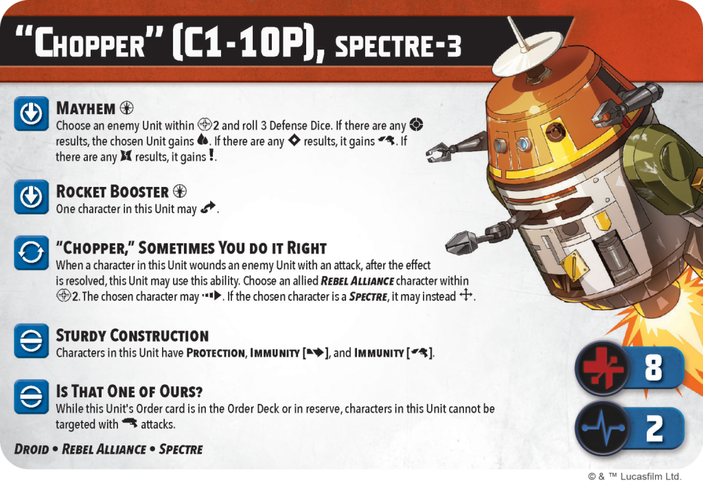 If Chopper’s Order Card is still in the Order Deck or in Reserve, Chopper can’t be targeted by Ranged attacks. I love this ability. That 4 Range defense doesn’t seem so bad if he can only be targeted part of the time.Gameplay Tactics