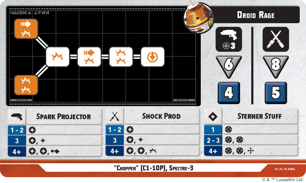 Copyright AMGChopper’s single stance, Droid Rage, is fairly simple. You get to choose where you start, either dealing two damage, or dealing out one damage and a shove. After that initial choice, there is only one path for Chopper to go down on his Combat Tree. Chopper deals out 4 damage, a shove, and an Active Ability in the final spot. Chopper gets 6 Attack Dice at Range 3, 8 melee attack dice, and finally 4 ranged defense and 5 melee defense. Do not let the 4 ranged defense scare you away from using him, his abilities make him much more durable than that would lead you to believe. His Defensive Expertise, Sterner Stuff, has three tiers and grants a block, 2 blocks, and finally 2 blocks and a reposition for 1, 2-3, and 4+ expertise rolls respectively. His attack expertise tables are nearly identical. They both have three tiers: 1, 2-3, and 4+. These two charts give Chopper a Crit, a Crit and a Strike, and finally two Crits plus one additional effect. The ranged expertise grants a disarm, and the melee expertise grants a damage in the final tier in addition to the other effects.