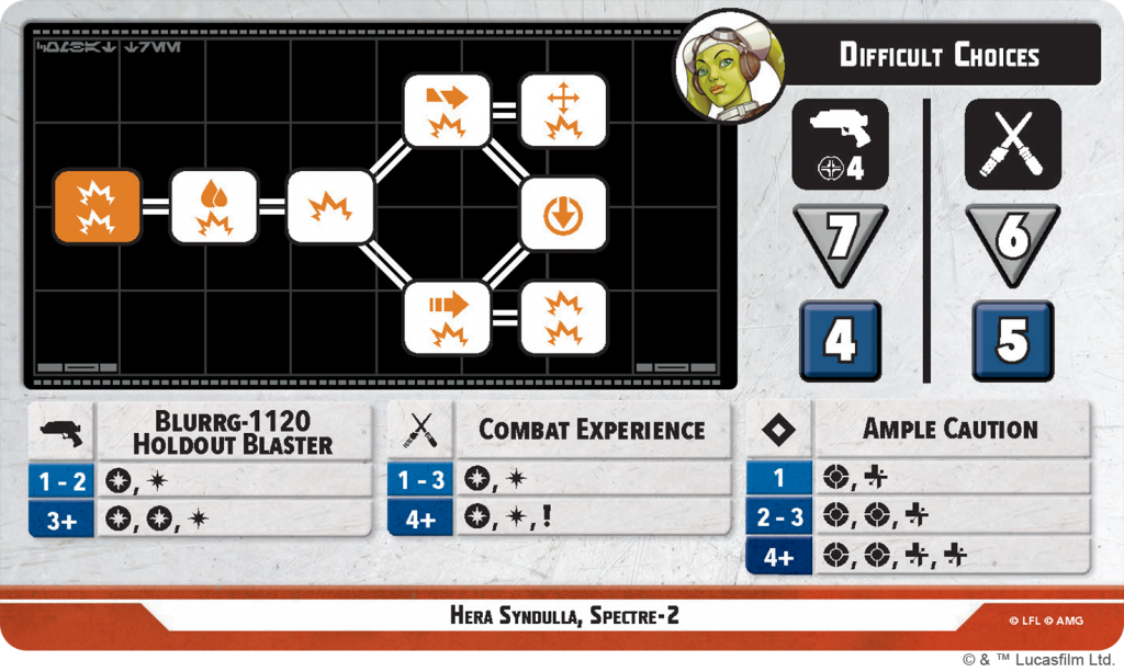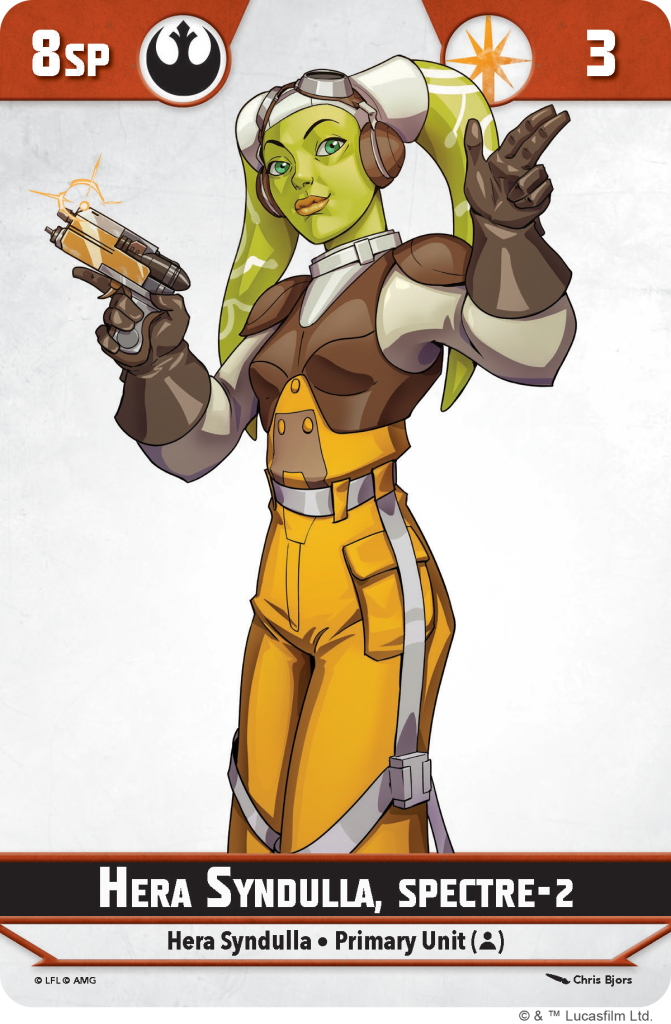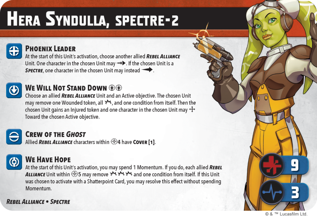 Copyright AMGHera Syndulla (Spectre-2) is the Primary unit in this box. She brings 8 squad points and 3 Force with her to help with Strike Team construction and paying for those sweet, sweet abilities. Like most Primaries, she has two stances available for players to choose from, and both her Difficult Choices and Spread a Little Light stances offer the same amount of offensive dice for ranged (7) and melee (6) attacks. As far as dice go, the only difference is in her defensive dice. In Difficult Choices she gets 4 ranged defense dice and 5 melee defense dice, and in Spread a Little Light she gets 5 ranged defense and 4 melee. She also has 9 Stamina and 3 Durability. Hera also has the keywords of Rebel Alliance and Spectre.