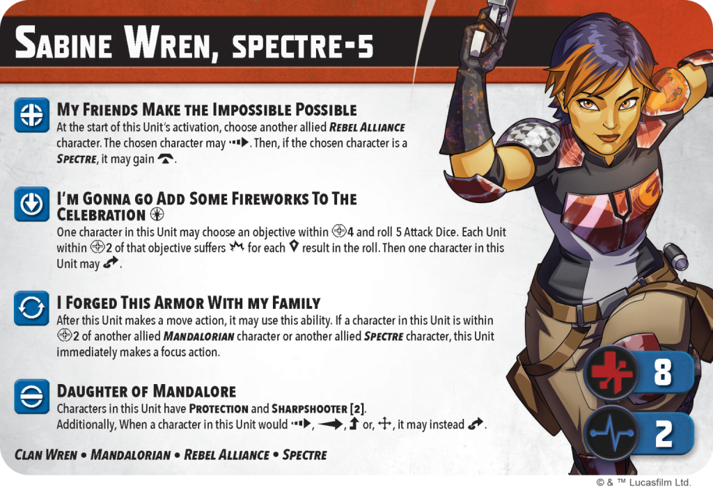 First, great job AMG on naming this active ability. I love it. Now, what does it do? For the cost of one Force, Sabine can choose an objective with Range 4. She then rolls 5 attack dice. For each attack expertise roll, all Units within Range 2 of the chosen objective suffer one damage. Sabine can then jump after this action is resolved. I really like this ability A LOT. For one, any time you can hand out automatic chip damage and your opponent doesn’t get to roll any defense dice is a good ability in my book. Additionally, the objective you choose doesn’t have to be an active objective. So if your opponent has a lot of units clustered around an objective they believe will be active during the next struggle, or they’re passing by one on their way to an active objective, Sabine can just make things go BOOM. However, you will want to make sure you don’t have any of your own units around the objective, or that they are units that can take the damage.I Forged This Armor With My Family