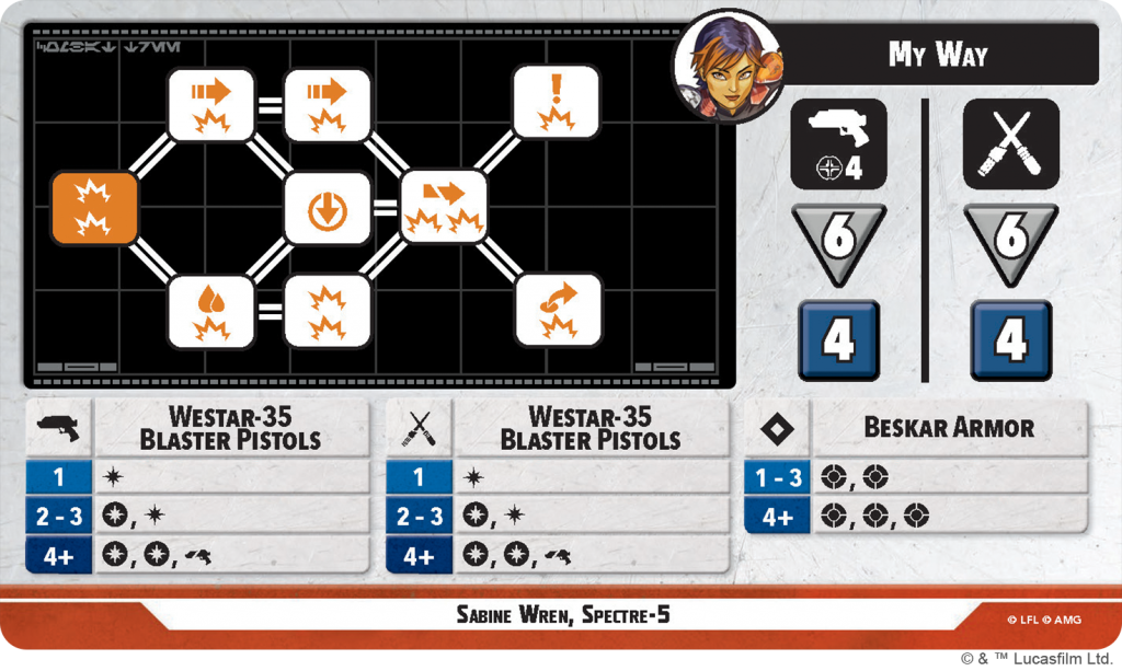 Copyright AMGSabine’s lone stance My Way, grants her 6 Ranged attack dice at range 4, as well as 6 Melee attack dice. She also has 4 defense dice for both attack types with her Beskar Armor. Her ranged attack expertise has three tiers for 1, 2-3, and 4+ expertise rolls, and her melee expertise has the same number of tiers. Additionally, both give you a strike, a crit and a strike, and then two crits and a disarm for the final tier. After the first spot on her combat tree, you have the option of choosing the upper path, which grants more control with two shoves and two damage, or choosing the heavier damage of the bottom path that grants a strain and three damage. If you roll 3 expertise, you also have the option of using her active ability. The final three spots on her tree grant two damage and a pin, and finally either an exposed and a damage, or a jump and a damage.