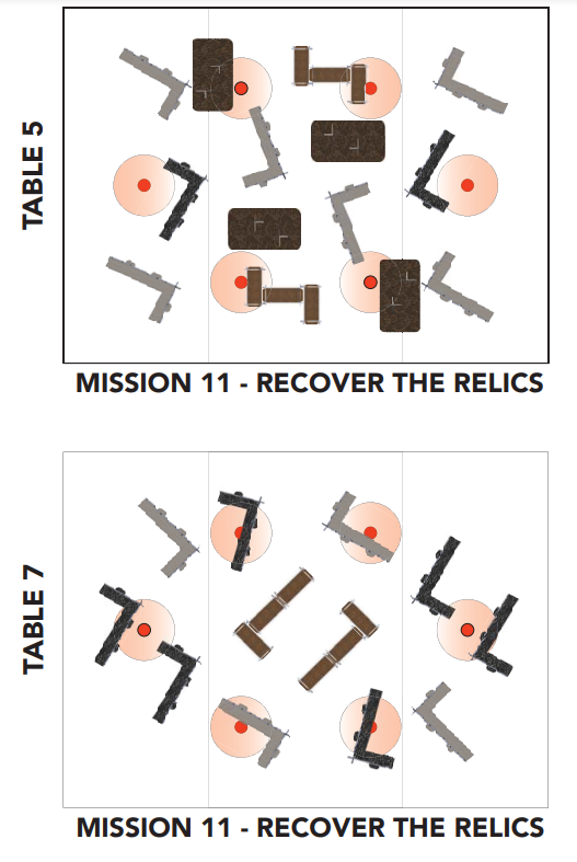 Prior to each round, players get to review their opponents full rosters (though since the lists are published weeks in advanced, most come in with a plan for matchups pre-made), and then the pairings process is executed to decide how the eight players from each team pair off, and which tables they will play on. Unlike a lot of singles events, the terrain on every table is not the same - instead, for each round, there are eight different maps with varying levels of terrain on them.The map pack is available here, and as an example of how maps can differ, take a look at maps seven and five from the first mission, Recover the Relics.