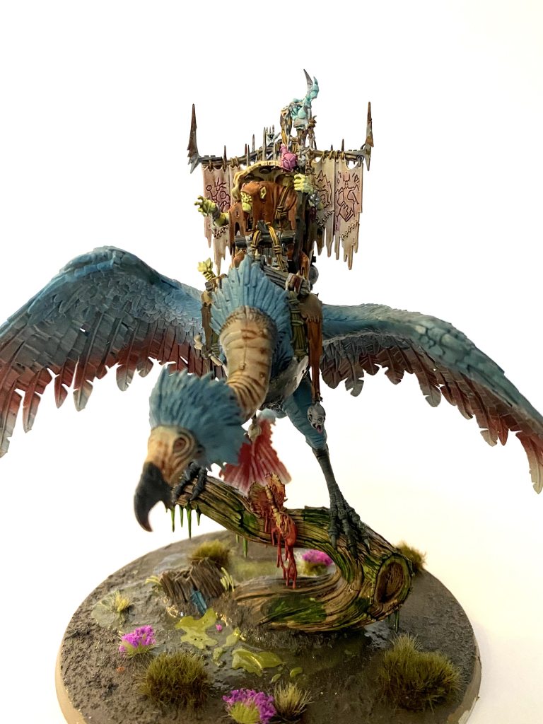 Killaboss on Gnashtoof/Vulcha - The Gnashtoof is a very tanky mobile piece with a natural 3+ save and 10 wounds for only 120 points, while still able to do enough damage to act as a reasonable assassin or bully piece on the flanks. If you want something a bit pricier, the Vulcha gives you even more movement with the trade-off of being a bit more vulnerable with only a 4+ save, though being a Monster he's better able to flip objectives under your control and contribute key Roars. Generally you'll take a Gnashtoof or not bother with a Killaboss at all, but both of these options are priced to move and are worth consideration.