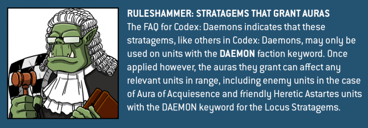 There are seven generic Chaos Daemon stratagems and 3 for each god in the main Codex, while Engine War introduced an additional 20. These stratagems are broken into 4 for each allegiance, and each one affects a specific unit or set of units (such as PLAGUEBEARER CAVALRY). Four of these are the Exalted Greater Daemon stratagems, which upgrade a greater daemon unit in important ways.Note that, despite the wording on Stratagems to refer to CHAOS DAEMON units, it has been ruled via FAQ that you cannot target other factions' daemons (such as Thousand Sons Daemon Princes or Myphitic Blight-Haulers) with these stratagems. Other abilities such as auras and unit abilities affect Daemons from other books, though. This is a pretty subtle distinction, so it’s worth keeping in mind - you can’t use a stratagem like Locus of Wrath on a Chaos Space Marines Daemon Prince of Khorne, but once you’ve used it on a Bloodmaster, that aura won’t care what faction the relevant daemons belong to, so the Aura will affect Khorne Warp Talons in range.