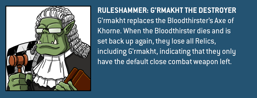 G’rmakht the Destroyer – Replaces an Axe of Khorne with one has a damage floor of 3. Additionally, when the model is killed you roll a D6 and on a 4+, you stand that model back up with D6 wounds remaining. It loses all Warlord Traits, Relics, and Exalted abilities it had and instead gains Rage Unchained (count as double wounds remaining for profile purposes). If it was your Warlord, your Warlord still counts as having been destroyed. This is a pretty neat suite of bonuses. The damage floor on the axe is pretty great, and helps make non-Insensate Rage Bloodthirsters quite a bit more viable, plus the “get back up again” ability is neat, though standing back up with only the default melee weapon means your Bloodthirster is uh, not going to do that much with, best-case scenario, 7 S7 AP- attacks. That said, note that this interpretation of the rules for “losing the axe” is a bit odd and it’s unclear if “having no weapon” is the intended state when you stand back up versus “having the default axe.” B