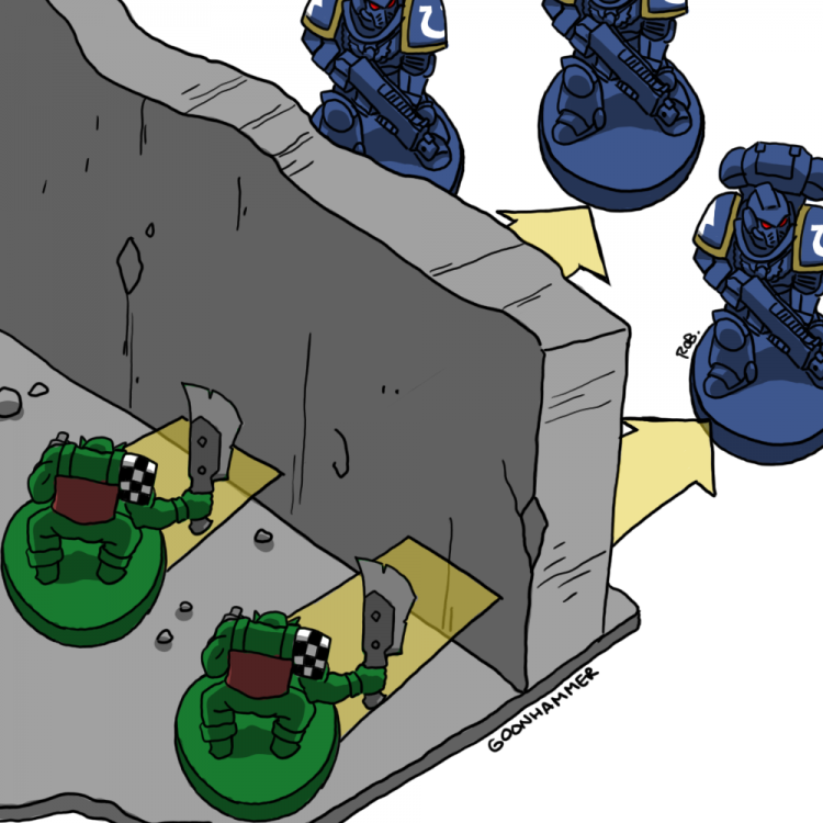 - If you are planning to charge something with nasty overwatch with your INFANTRY, and you have the space to do so, charge from behind a wall, as it avoids overwatch. A lone CHARACTER doing this is a good way to stop overwatch on behalf of a unit that can't go through the wall themselves.
