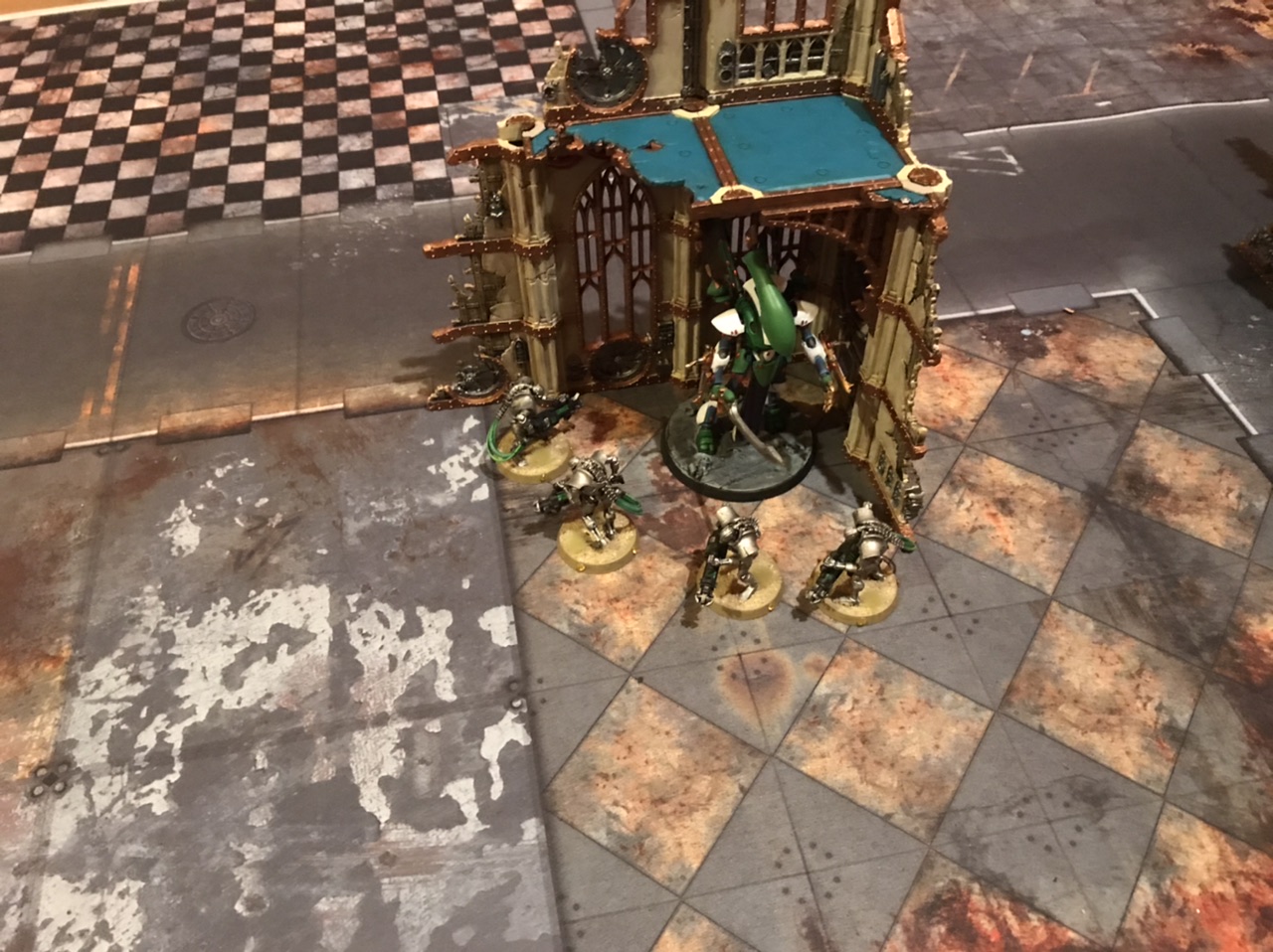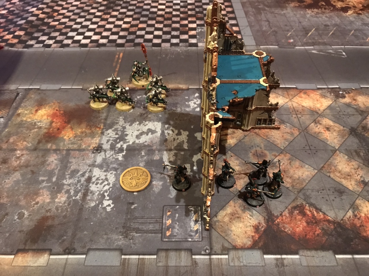 The Immortals want to shoot Eldrad, but the Dire Avengers block them.Defensive Positioning with Ruins - Charges and Fighting