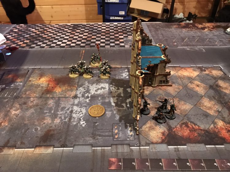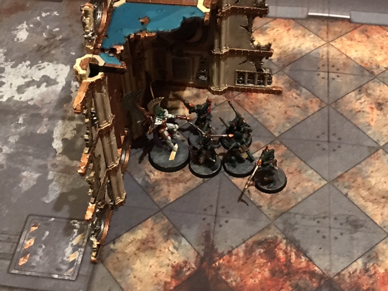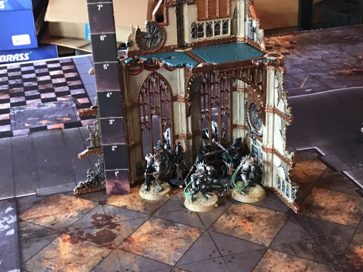 Some Kabalites get a nasty surpriseA final thing you can do with a corner ruin and a transport, when you're up against a powerful non-INFANTRY melee unit, is create a safe zone for passengers to escape to and to protect key assets. You need to be a bit cagey about this when against FLY units as they might be able to make smart use of coherency to sneak some models in, but it's often a practical way to make a last ditch stand against superior foes.