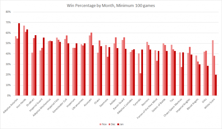 Looking at the win percentages by month shows clear improvement for the Astartes and Iron Hands in January, while White Scars have been in decline. Blood Angels as well, hinting at the notion that shooting-first strategies for marines are on the rise.