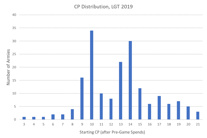 Having full access to a searchable set of lists allows us to do some more interesting analytics around the contents. One example is looking at Faction CP, where we can see that most players either have 10 CP or 14 CP to work with when the game starts, and points to two Battalions as the most common army structure.