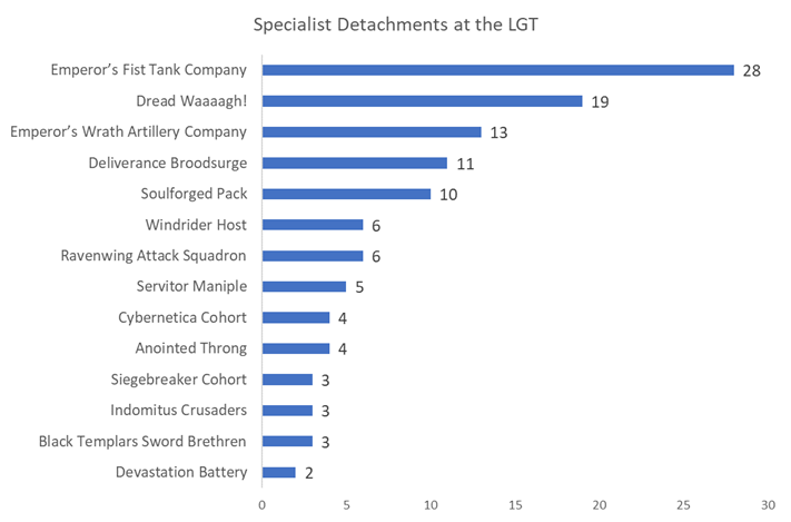 More than 100 LGT lists are using Specialist Detachments, with the most common being Dread Waaagh! Specialist Detachments account for nearly one fourth of those used and appear in every single Ork army being run (19 out of 19). So if you're up against Orks, expect a lot of double-firing relic Shokk Attack Guns. Similarly, Soulforged Packs show up in 6 out of 10 Chaos Space Marine armies, so expect to see a lot of Lords Discordant making use of those. And 11 out of the 13 Genestealer Cult armies are running the Deliverance Broodsurge (1 is running the Anointed Throng), so if you see Genestealer Cults, plan on dealing with their close combat tricks.