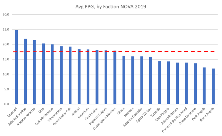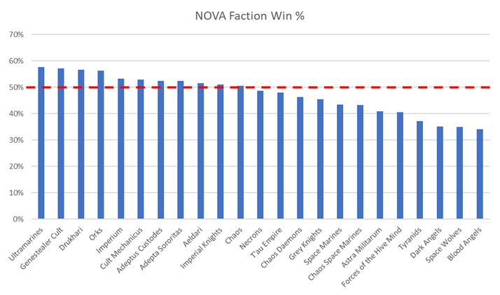 Here's where we can see that Drukhari are really in another category altogether when it comes to generating points in the NOVA format, but not necessarily in a way that translates to wins. This is the part where I have to vent my frustrations with the BCP app and how difficult it is to extra data from it; I'd love to have data on the average margin of victory and opponent points scored for each faction, but pulling that data from BCP is currently too difficult and time consuming. Instead, we can infer that Drukhari, who score the most points per game by a significant margin but do not also average the highest win rates, probably also surrender more points per game on average. Similarly, Chaos were about average in win % but below average in scoring, suggesting that they likely gave up fewer points on average than other armies. Something interesting to consider, and worth looking into if the data becomes available.