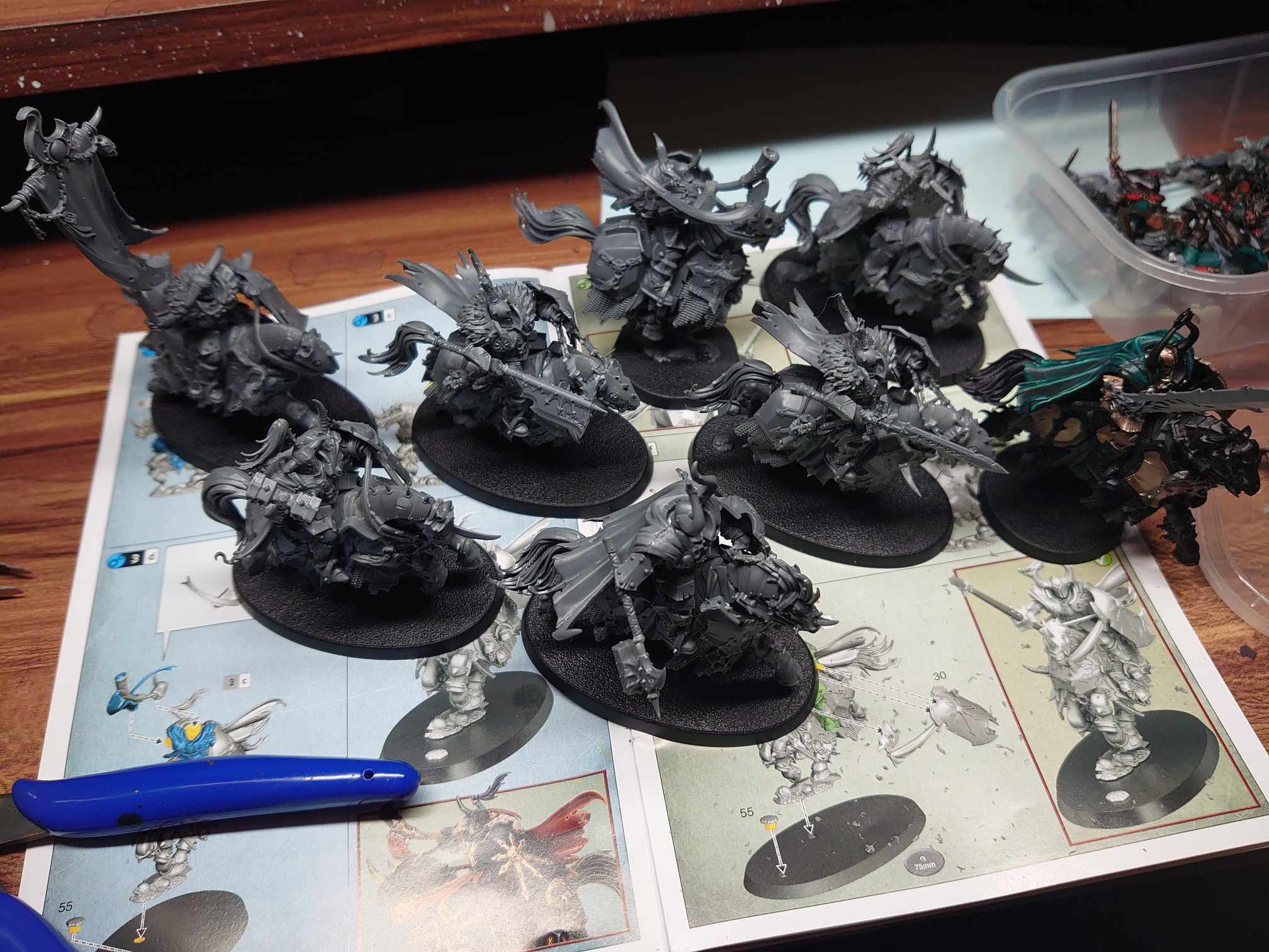 This overhang issue has kind of been the story of the hobby project overall. I’ve made myself adhere to a sort-of rule called Preferred Model Count, or PMC. Basically, the idea is that a regiment should look like a regiment, and so on - no units of like three bois pretending to be a horde. I didn’t quite understand at the start just how little the competitive community actually cared about this, and now I’m mostly just adhering to ‘does the base look full’, but this was the last unit I put together before that really sunk in. This is why all the cavalry have eight models on there - if I were doing this again, I think I'd have went with five apiece, as it would still give a decent sense of the weight of these bois (who are really hefty cavalry), while not overhanging further than a beer bracket day two.