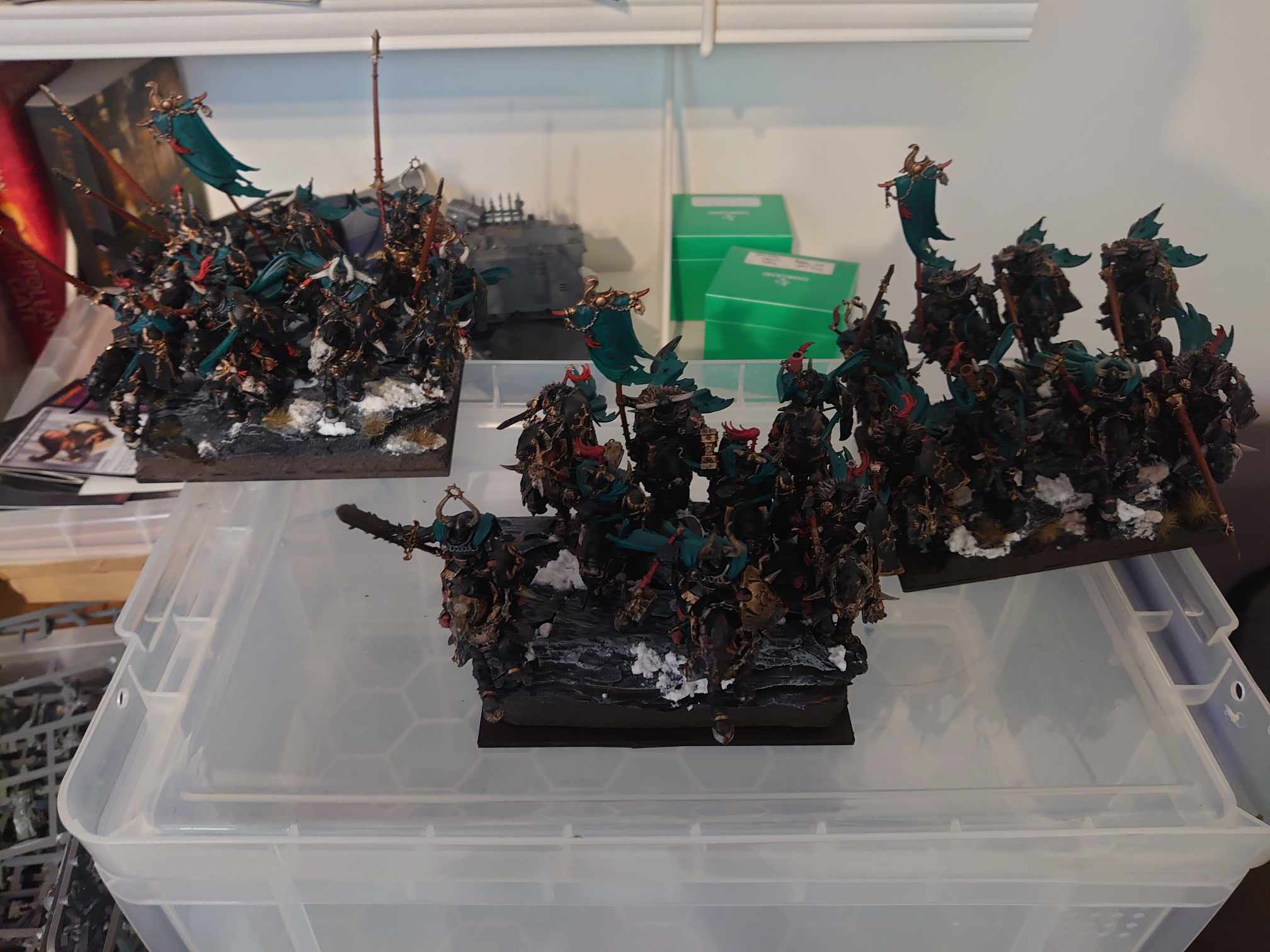 First on the docket? Hobby progress. I promised new and exciting frontiers in overhang on models last time, and I feel like I’ve delivered. My third unit of Mounted Sons of Korgaan are distinguished from their friendos by not having lances at all, and instead just having whatever spare weapons I had lying around. It’s nice to be able to easily differentiate - lances up, lances down, no lances. You’d think that not hefting several foot long spikes would mean the base space problem would be reduced, but, uh, no.
