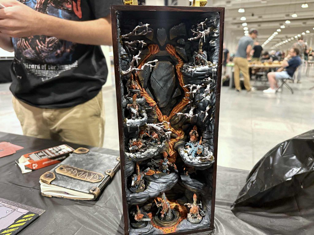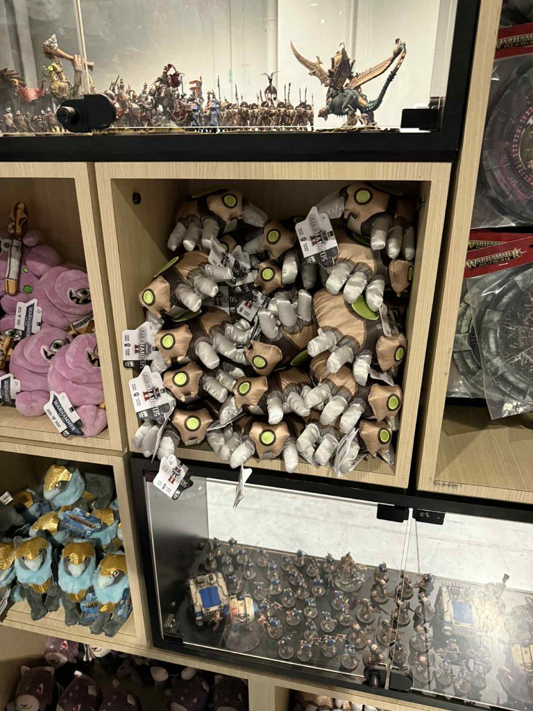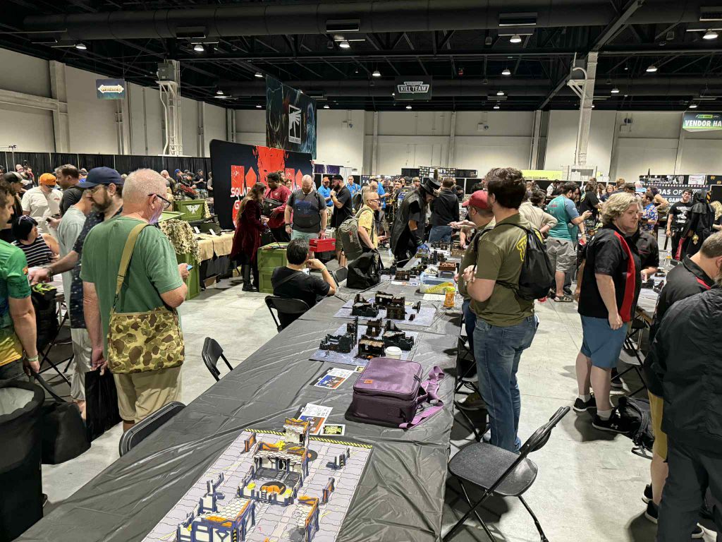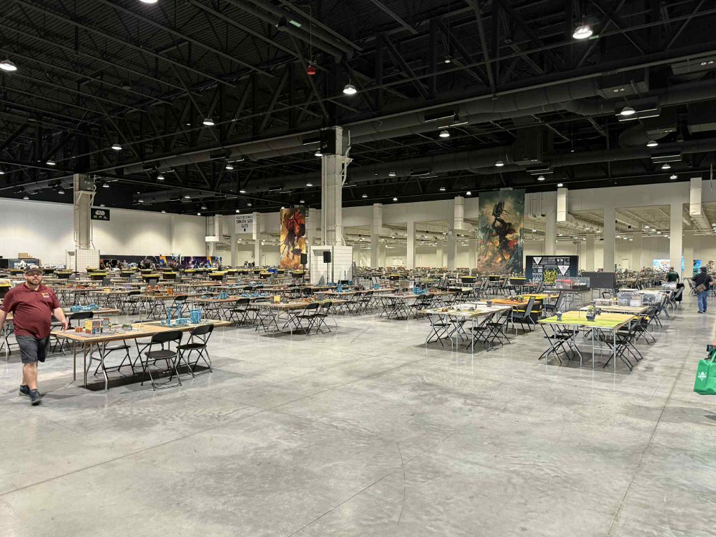 Once I’m all checked in, I meander on over to the vendor area to check out all the goodies. It’s neat to go to a gaming event like this and see so many shops, most of the time its just a few local spots with booths (if there are vendors at all), but FLG pulled out all the stops here. The Games Workshop area is the largest, of course, busting out their road show traveling store setup. Aside from the models, the store has neat stuff like art posters, limited event exclusive objective markers, and just an absolute ton of little scarab plushies, packed to bursting in a little wooden cubby. I buy two, one for my kid and one for my friend, and leave the vendor hall.