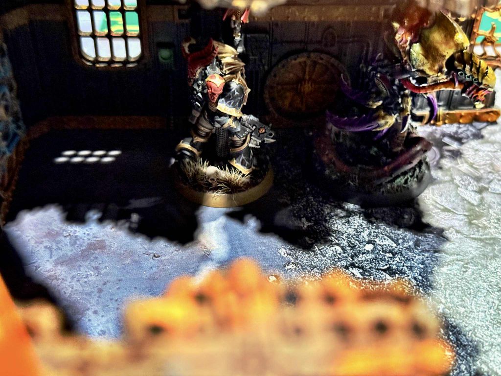 I win initiative, and make a big charge into the Gunner, killing it and then bouncing into his Breacher with Proclivity for Murder. I can stall his fallback for at least one turn, and already Robert’s on the backfoot here. His Aegis takes care of the Screecher handily, but turning around to do so prevents his Aegis from scoring Envoy. From here, I just need to keep up the pressure and make sure he doesn’t get the chance to recover. Even one Deathwatch operative can do a ton of damage real quick if they catch you out.
