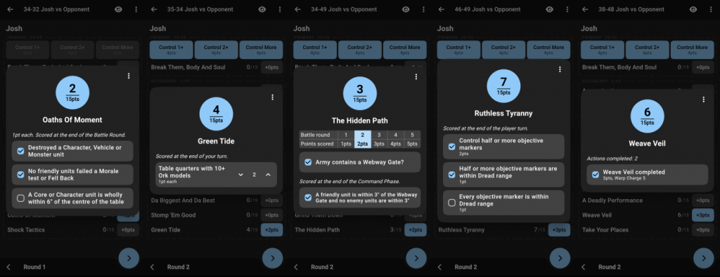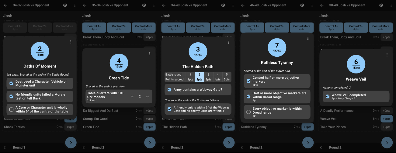 In an effort to make your life easier and mine much harder, a whopping 274 smart score entry elements have been added in this update. This includes every faction secondary, mission primary, and mission secondary for Nephilim, Eternal War, and Tempest of War. Rather than manually entering the points you’ve earned, you can simply read the options and select the ones that apply to gain points.A big part of adding the smart score entry was a series of behind-the-scenes changes to how game data is created and stored. We moved from a partially data-driven approach to a fully data-driven approach (including the math behind these smart scoring widgets). This not only means that we can make changes to mission packs faster, but it will also open up some possibilities like custom mission packs that we can explore in the future.