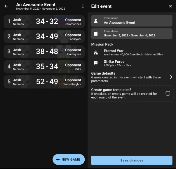 A few changes were made to the event page to make editing an event easier. The old event name and date fields have been removed in favor of an “Edit event” option in the menu. This will allow you to retroactively set the event mission pack or defaults. You can even create game templates in the edit screen after an event has been created.
