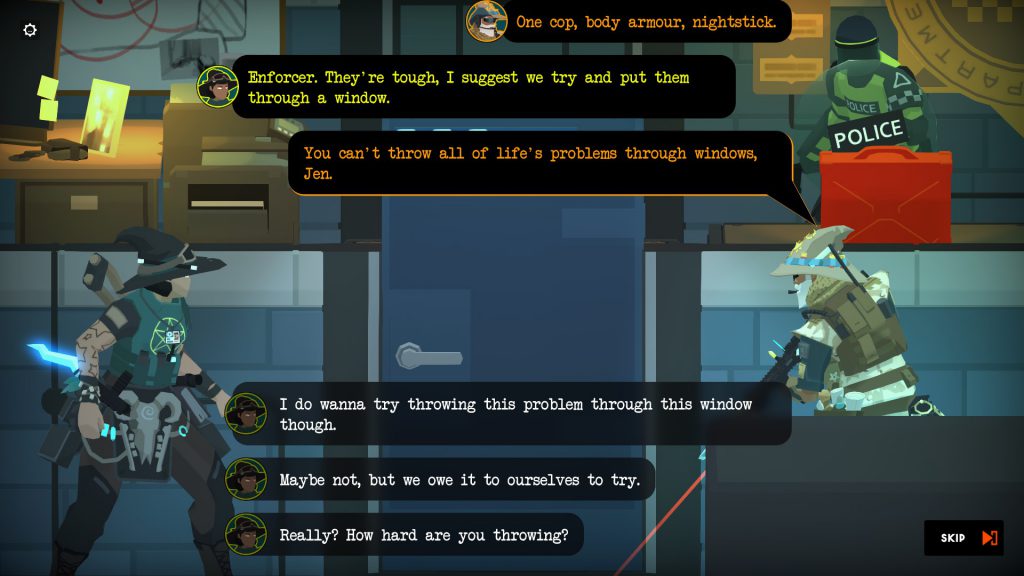Sometimes, levels are just thought-exercises in how to throw as many big dudes out of windows as you possibly can.In the later half of the game, near the climax, there are a lot more big dialogue sections with lots of fun choices that I really wish I could replay easier to see all the things I missed. The full cast speaking to each other really is a treat I’d love to see more of.