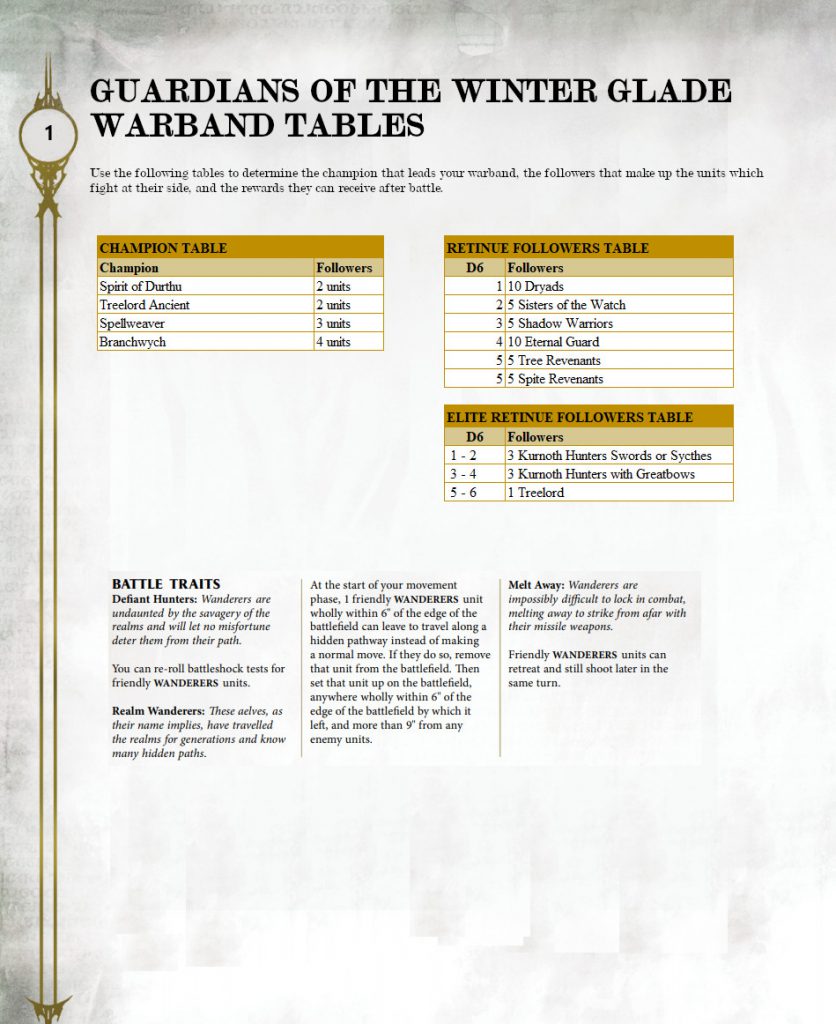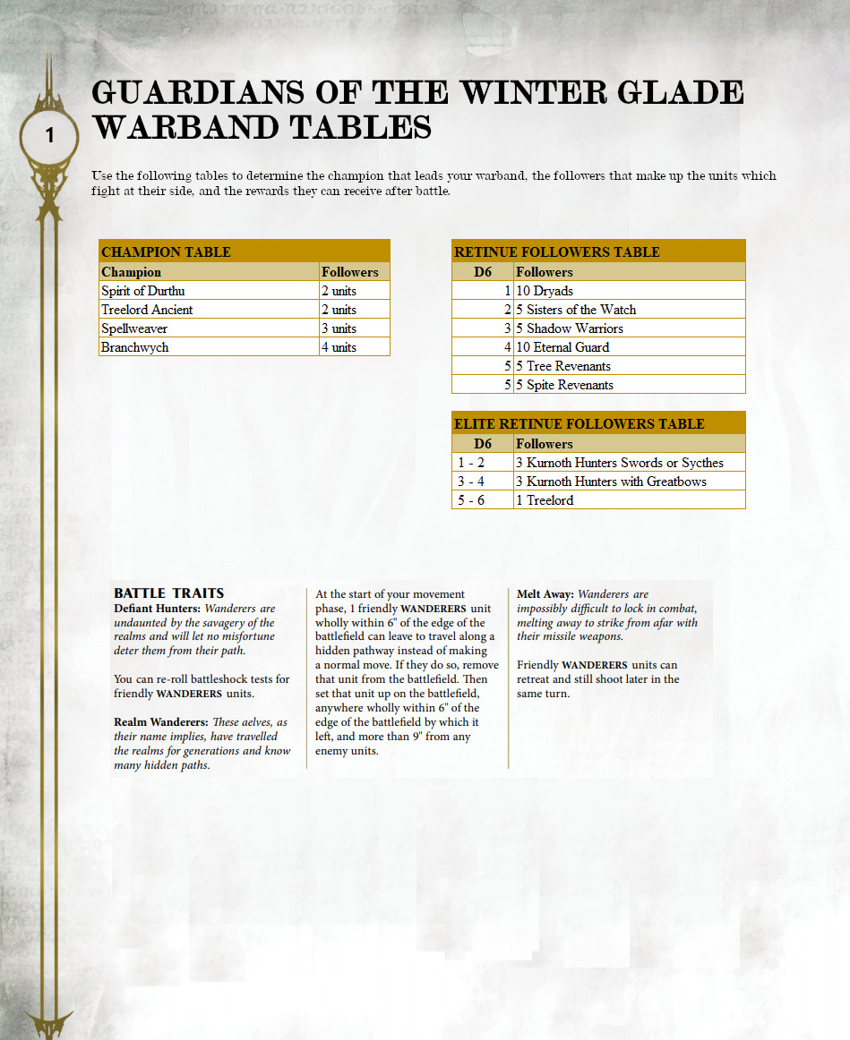 The tricky part from my perspective is that Wanderers don't have any Path to Glory tables or rules, and I'm also running a mixed Wanderers and Sylvaneth hybrid army so I'll need to tweak the tables (I have permission from my opponents on this so it's cool and good(tm)).