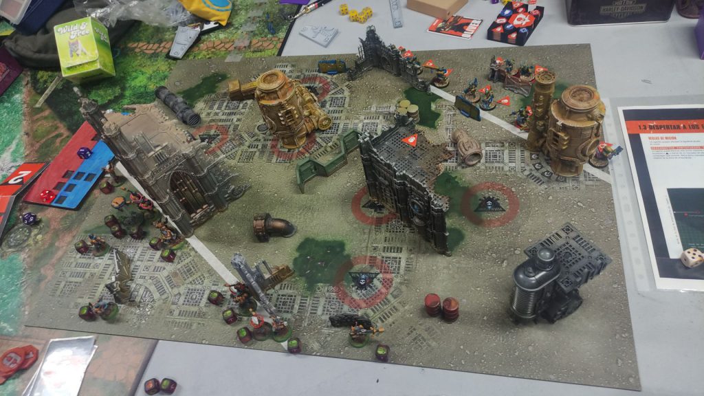 When it comes to how much of each to use, you want 5-6 elements with the Heavy trait, i.e. provides Cover and is Obscuring, and 4-5 elements with the Light trait, which provides Cover unless otherwise specified. This will give you a good mix of features to work with and give operatives the ability to cross the table while not making it safe to do so. Again, Octarius is a great example here (see above), as it provides you with 4 large heavy ruin sections plus the derrick and another six pieces of light terrain made from piles of junk and makeshift walls.As you place terrain, put some heavy elements in the center of the table. You want to break up lines of sight so it's difficult or impossible to see from one end of the table to the other. Important in any wargame with shooting, and important here.