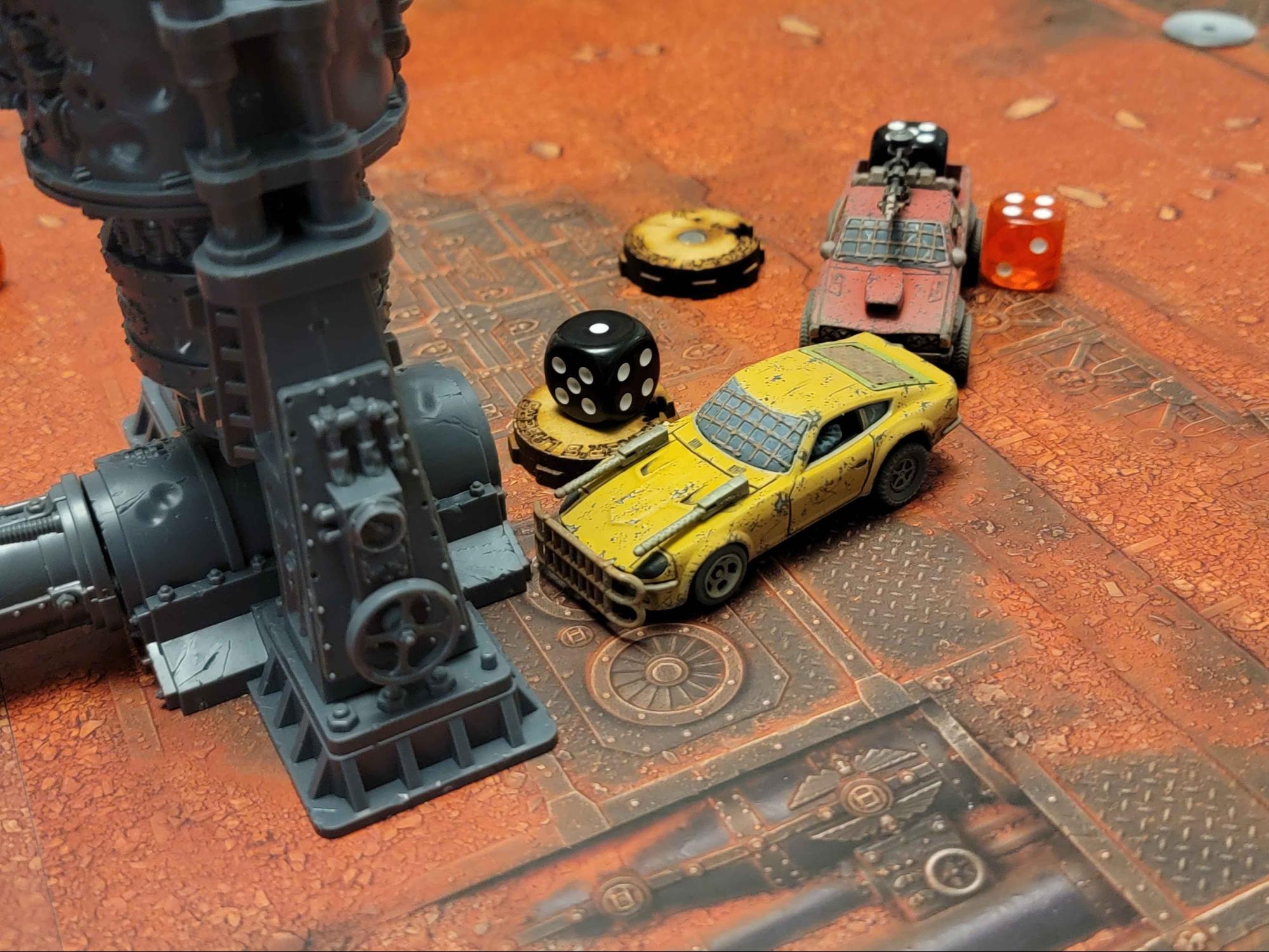 Pit maneuver.My car managed to cross the finish line first. Andrew's buggy shifted up to fifth gear to at least beat my buggy across the line, but he was slightly too close to the edge of the track, ramming into the light obstacle that marks the end of the line at high speed. On average dice you’d expect to take about 3-4 hull points of damage from that impact, but naturally his 6 HP buggy took exactly 6 HP from the collision, resulting in Andrew's buggy effectively dying by smashing directly into the checkered flag. I’m pretty sure this moment sold Andrew on the game as a whole.