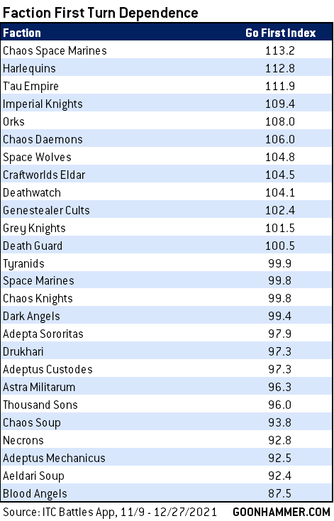 The net result is something that shouldn't shock us: While many 9th edition books do better with first turn, 8th edition armies, particularly Chaos Space Marines, Harlequins, T'au, and Knights, depend much more on having the first turn in order to compete. Of interesting note here is Blood Angels, who appear to depend on having the first turn much less. These factions also have some of the greatest gaps between their go-first win rates and go-second win rates. Note that Drukhari and Grey Knights have among the lowest gaps, because their win rates going first or second are very high.