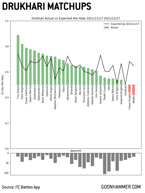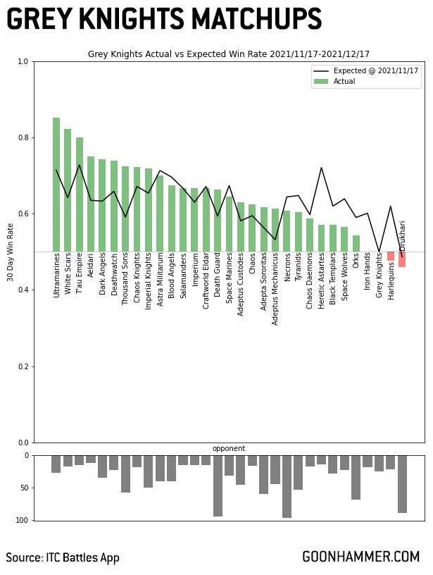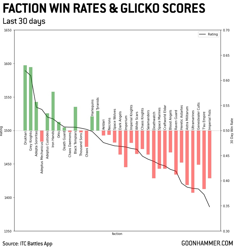 Grey Knights are likewise sitting very pretty in the standings in terms of win rates and Glicko scores, and do particularly well against marines of most flavors - only Iron Hands seem to match up well against them. In that regard, they've only got one fewer positive matchups than Drukhari, but it's worth noting that one of the Grey Knights' negative matchups is against Drukhari, which is why they're still sitting at #2. Wings: in particular, Talos are a nightmare for the best Grey Knight lists.