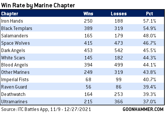 We also frequently check the wonderful site 40kstats.com for some results data and to look at lists. It’s as large and complete a dataset as you could ever ask for for 40k. This month’s data specifically comes from the period ending on December 18th, 2021. The data contains tens of thousands of games worth of data from the ITC Battles app and Best Coast Pairings.