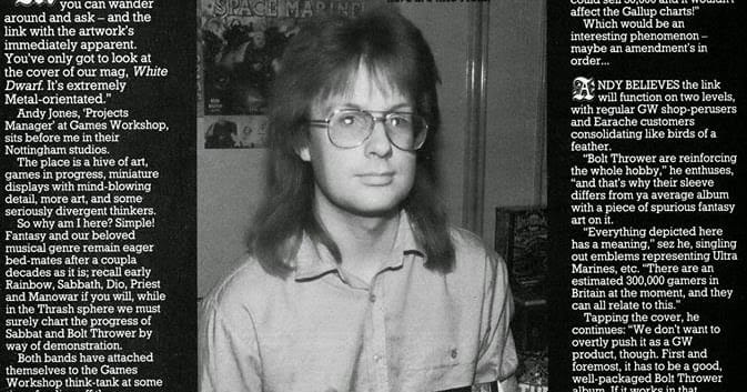 Jones got his foot in the door in telesales, soon branching into marketing and events organization. He handled advertisement for White Dwarf, organized the first Game Day, and along with the legendary Warhammer artist John Blanche founded the Golden Demon Awards.
