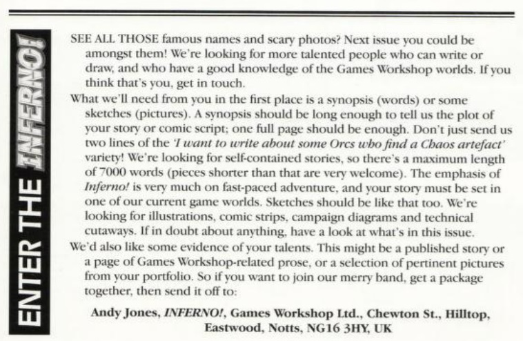 "Inferno! fulfilled, to some extent, this dream to do a GW annual, but it also did a lot of other things very quickly. The most important thing was that it taught us how to deal with freelance writers. People who were very good at spinning words, but also showed us the techniques we could use to harness their writing talents in creating fabulous stuff for Warhammer and 40K.
