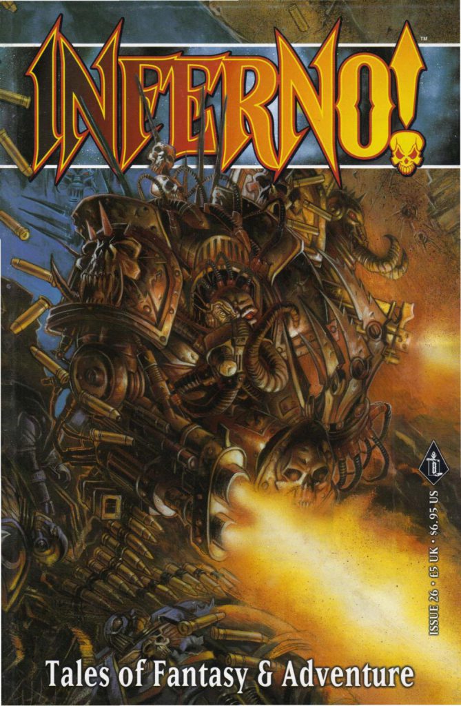 Inferno! had always contained a strong visual element, and many stories would have illustrations accompanying them. Note that titles in italics are original illustration works by the named title; otherwise, they are named after the story they accompany (the art itself is untitled).- Eisenhorn, by Karl and Stefan Kopinski. Inferno! #27 was a very consequential issue, and who better to lend it some added majesty than the Brothers Kopinski and their cover art of Inquisitor Eisenhorn? (Inferno! #27)