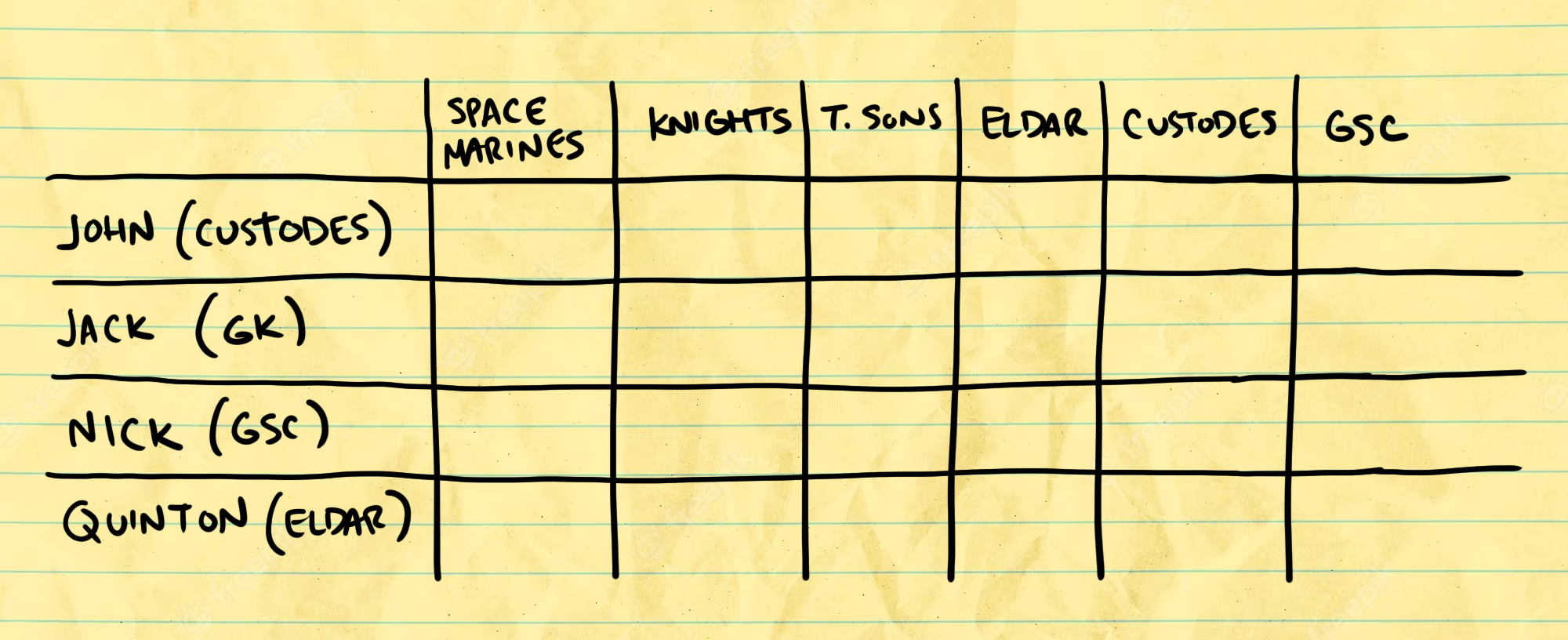 Our next step was to plot a pairings matrix. Which is essentially a grid chart with 2 axes. On the Y axis we plotted our existing armies/players, and on the X axis we put theoretical oppositions.A Rough Example
