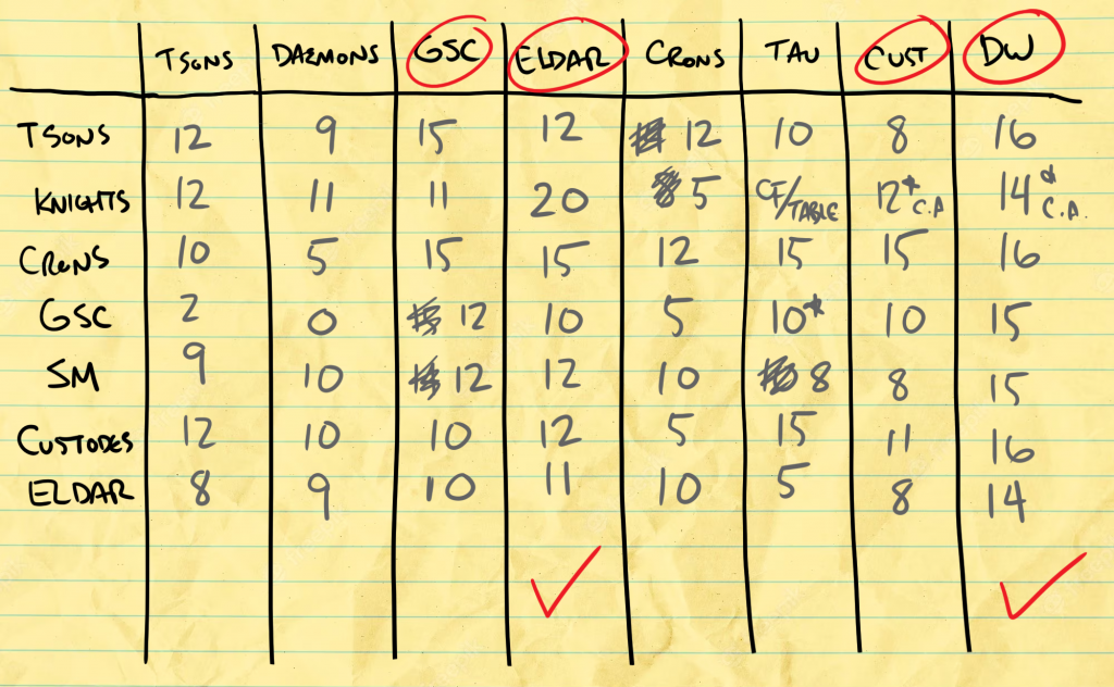 This pairings matrix drawn on our yellow legal pad is a key part of planning for a teams event. Going through this process forced us to think about every single match-up as a group and really give an honest assessment of what we expected to score. Then once you have those scores, you zoom out and we could develop a good picture of which armies we were good into and which ones we'd struggle with. That was information we could then use to help us identify what armies we should consider as our 5th option.