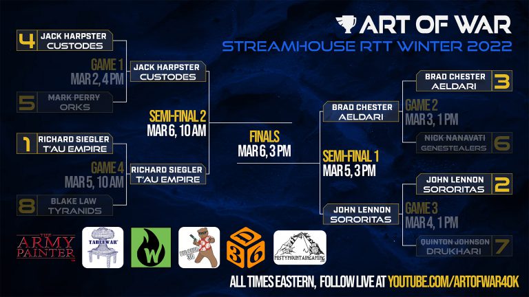 ...which just leaves us with the finals, which you'll be able to find on the Art of War's YouTube channel, and start at 3pm ET. We're secretly pulling for Brad, just for pure upset value.
