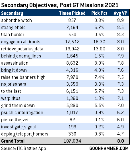 The release of the 2021 GT Mission Pack in June changed a number of secondary objectives and while we took an early look at secondary objectives in our July Meta Review, the limited data we had at the time necessitated a second pass on that data. So two months and a large number of events in, how do the current secondaries look?
