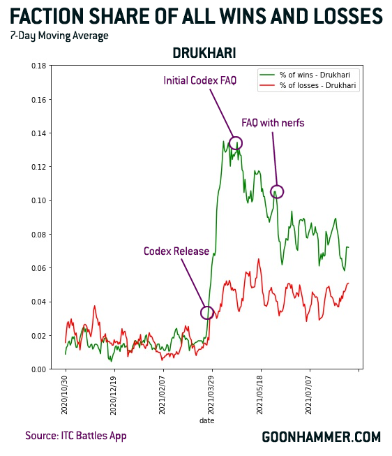Wings: My impression from compiling Competitive Innovations had been that Drukhari were pulling back ahead, and that seems to be borne out in the numbers. With that in mind, I’m pretty confident in saying that Drukhari need another round of nerfs, mostly in line with what I suggested when talking about what needed to change in AdMech. Nerfing AdMech hard always came with a risk of Drukhari resurgence, and in particular Ironstriders getting hit way harder than I anticipated (with the loss of CORE) really helps Raider-based lists stay on top. Right now, I’d go with: