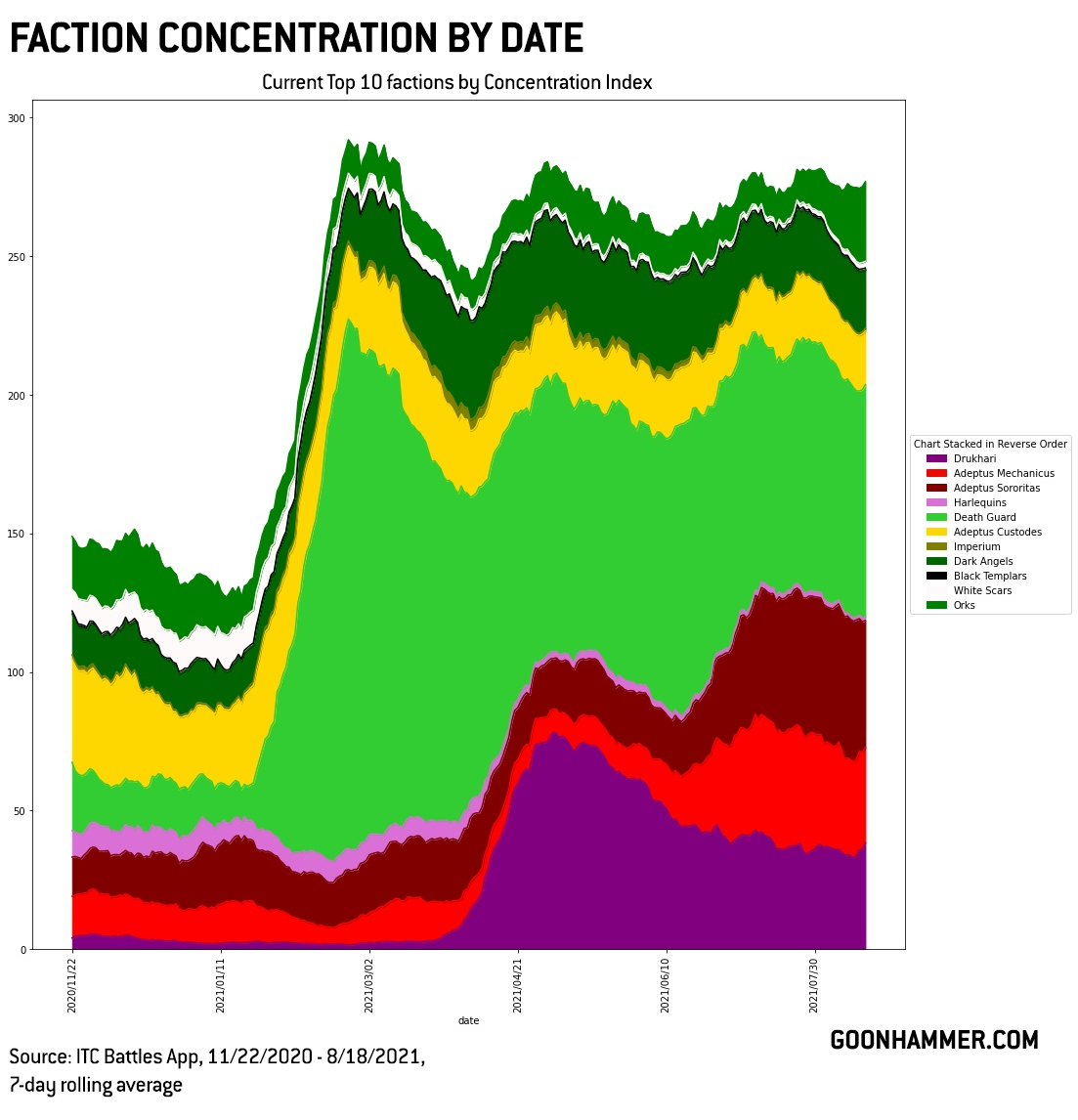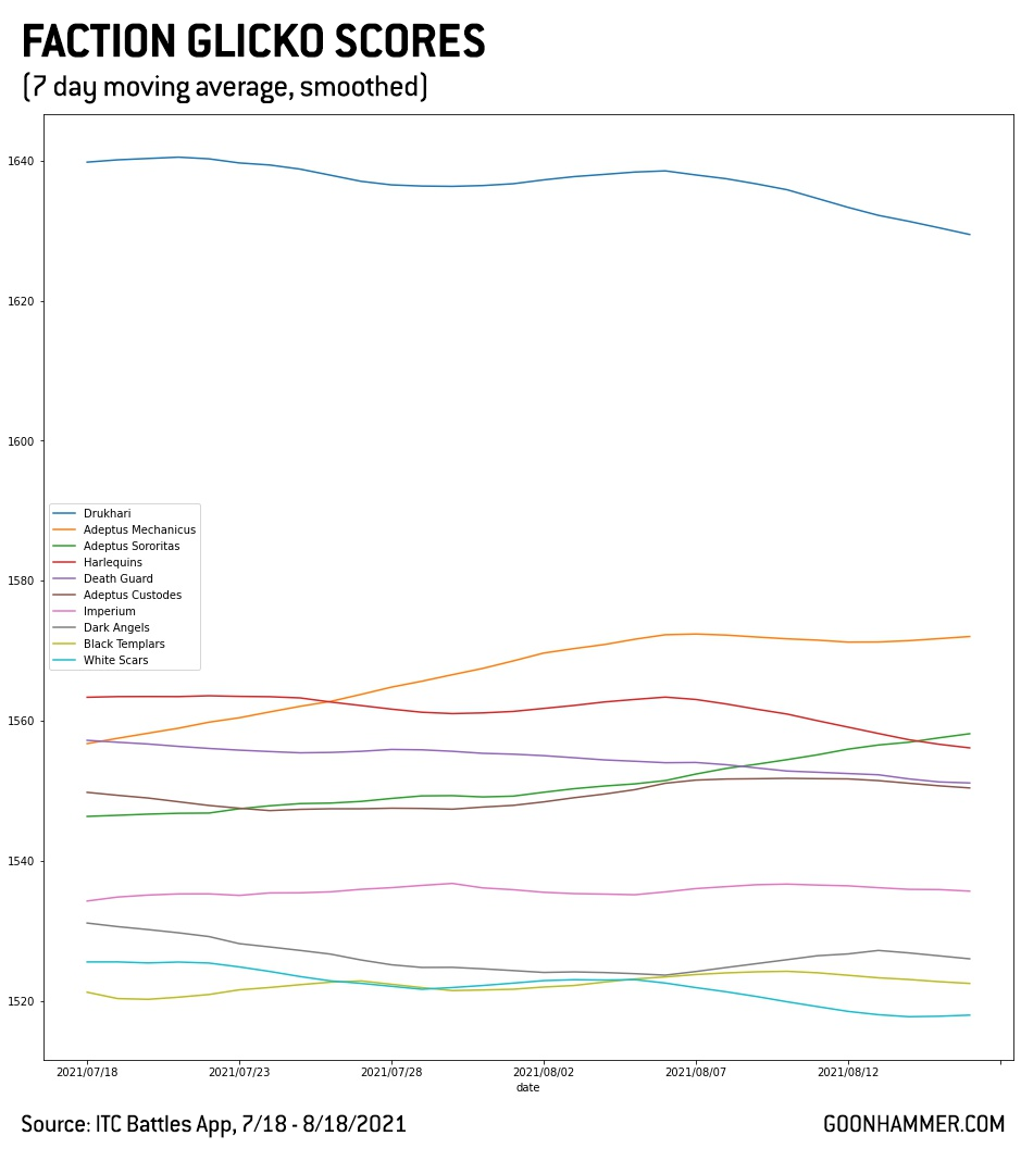 The original 9th edition bogeymen (and women) haven’t gone anywhere, despite multiple adjustments to bring them back in line. While they aren’t still putting up 70%+ win rates at either the GT or practice game level, they’ve settled comfortably into mid-60% win rates over the last month and a half, and depending on the time period you look at are either dead even with the Adeptus Mechanicus around 63% or are pulling ahead following the late July adjustments to Ad Mech. Whether Ad Mech players can adjust and the faction will be able to make up some of that ground will be interesting to see over the next month.