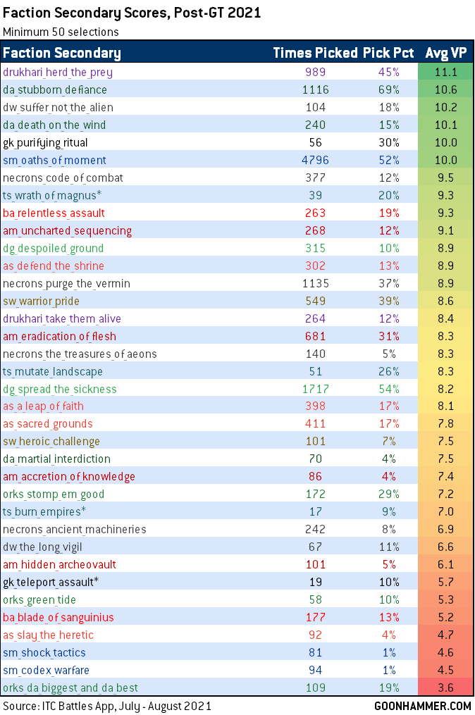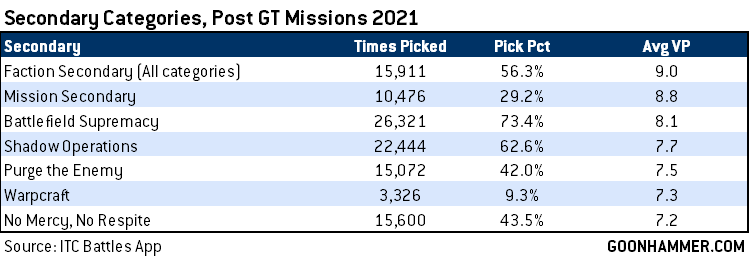 Otherwise, we’ve seen little movement on many of the other secondaries, though the extra point available for Assassination has raised the average on that secondary. If we look back, we can compare players' average secondary objective performance in each of three distinct "eras" for 9th edition - the Pre-January 2021 FAQ period (before tweaks to secondaries and primary scoring), the Post-FAQ period in 2021 prior to the release of the GT Mission Pack 2021, and the current period, with the 2021 GT mission pack.
