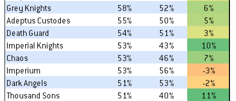 These early differences suggest that both factions are likely to see a strong increase in performance over their pre-codex incarnations, with Thousand Sons like being the biggest benefactor. We'll have more data on this next month, when we'll be taking a deeper look at all three factions.