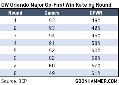 Furthermore, the Orlando event was not immune to the same challenges we’ve seen repeatedly in competitive play - namely, that as events progress and players are matched up in skill, the advantage inherent in having the first turn increases, as good players are no longer able to overcome going second by taking advantage of the skill gap between then and an opponent.