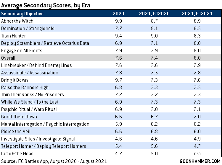 First, let’s talk about the good news: the average VP scored on many of the new secondaries has increased from the GT 2020 pack, and overall, the game’s generic secondary objectives are worth more points than before. Many now sport higher average scores than their prior incarnations in the GT 2020 Mission pack - Stranglehold is an improvement over Domination, while Retrieve Octarius Data is consistently providing higher average values (though potentially fewer than 10 points) than the all-or-nothing Deploy Scramblers. And Titan Hunter is less punishing than it used to be, now averaging more than a full point less than when it debuted one year ago.