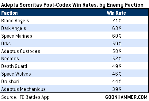 The Adepta Sororitas were one of the game’s top factions before the release of Codex: Drukhari and declined quickly after, not because of a power issue with their own book but rather because of the former’s dominance. Since the release of their 9th codexk they’ve seen a steady increase in performance as players have gradually caught on to how the new version of the army plays, spearheaded by the ITC’s current top player John Lennon, who took the army to a first-place finish at the Lone Star Open and a 2nd place finish at the Games Workshop Orlando event.In our win rate and Glicko scores, Sisters are the clear third-place faction; they're capable of winning many games, but their podium success has not been on the same level as Drukhari or Mechanicus. And in taking a deeper look at their head-to-head scores, we can see why: