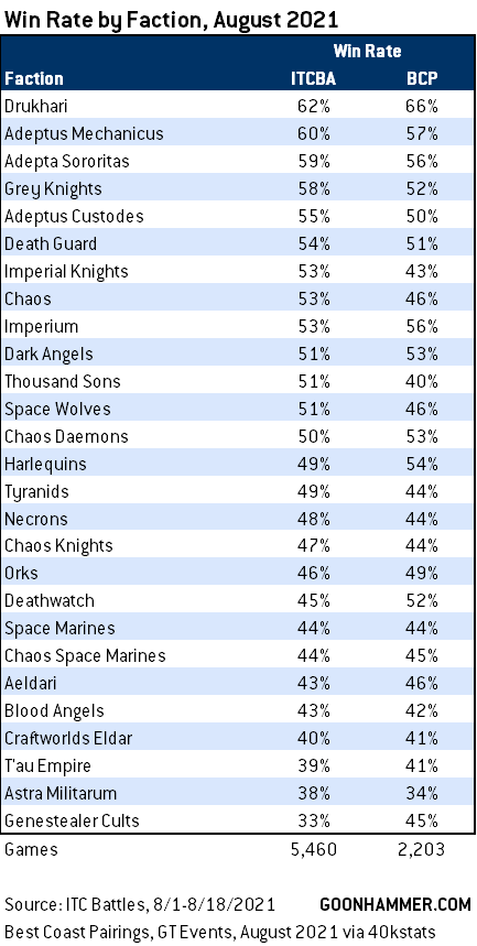 Unfortunately, these factions are still too new to have concrete performance data for - they have yet to make major tournament showings and neither is popular enough to have the volume of games in the ITC Battles App we’d need to see to get a good feel for the faction. The one thing we can potentially point to are the discrepancies in the August win rates between ITC Battles and GT results: