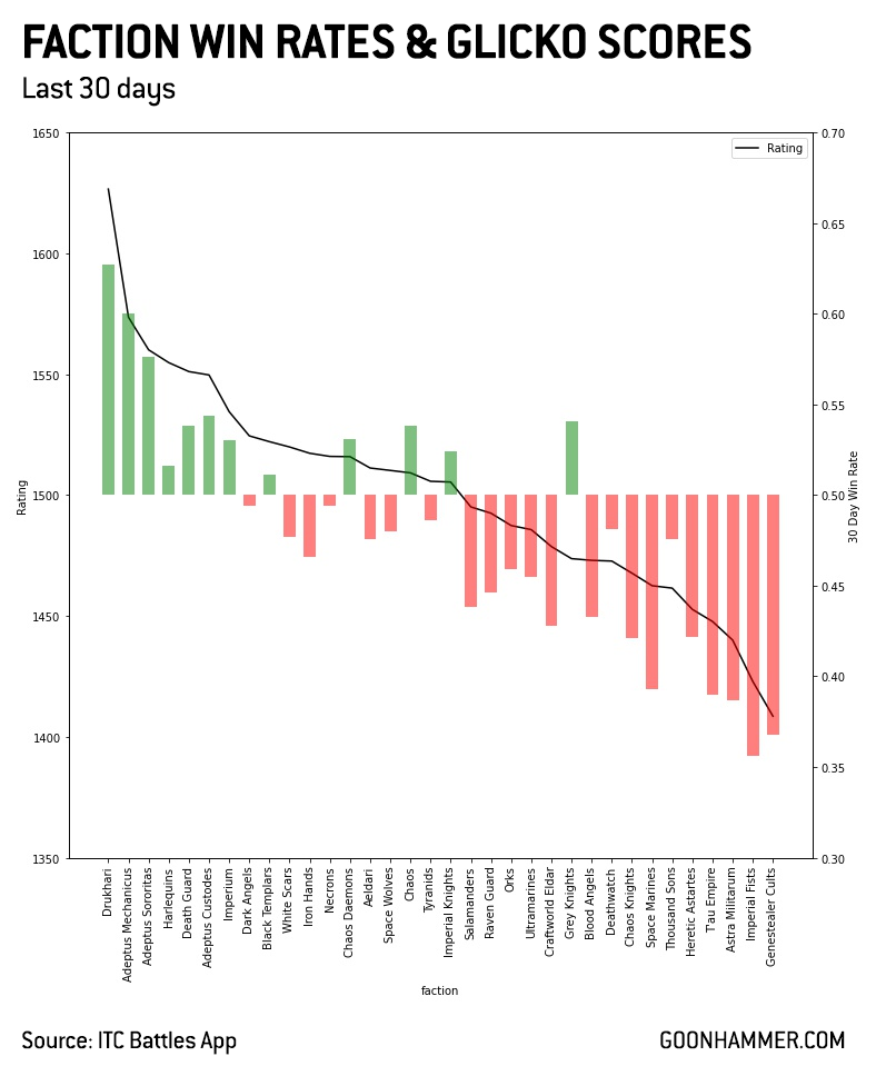 Glicko ratings - shown there as the black line - can be thought of as a type of ELO rating. That is, a faction’s score improves as it beats other factions, and improves by more when it beats factions with higher scores. Drukhari still top the faction Glicko scores but have been joined by the Adeptus Mechanicus and the Adepta Sororitas; we’ve had a few other moves in the last two months, but it's those two which are big upwards movers.