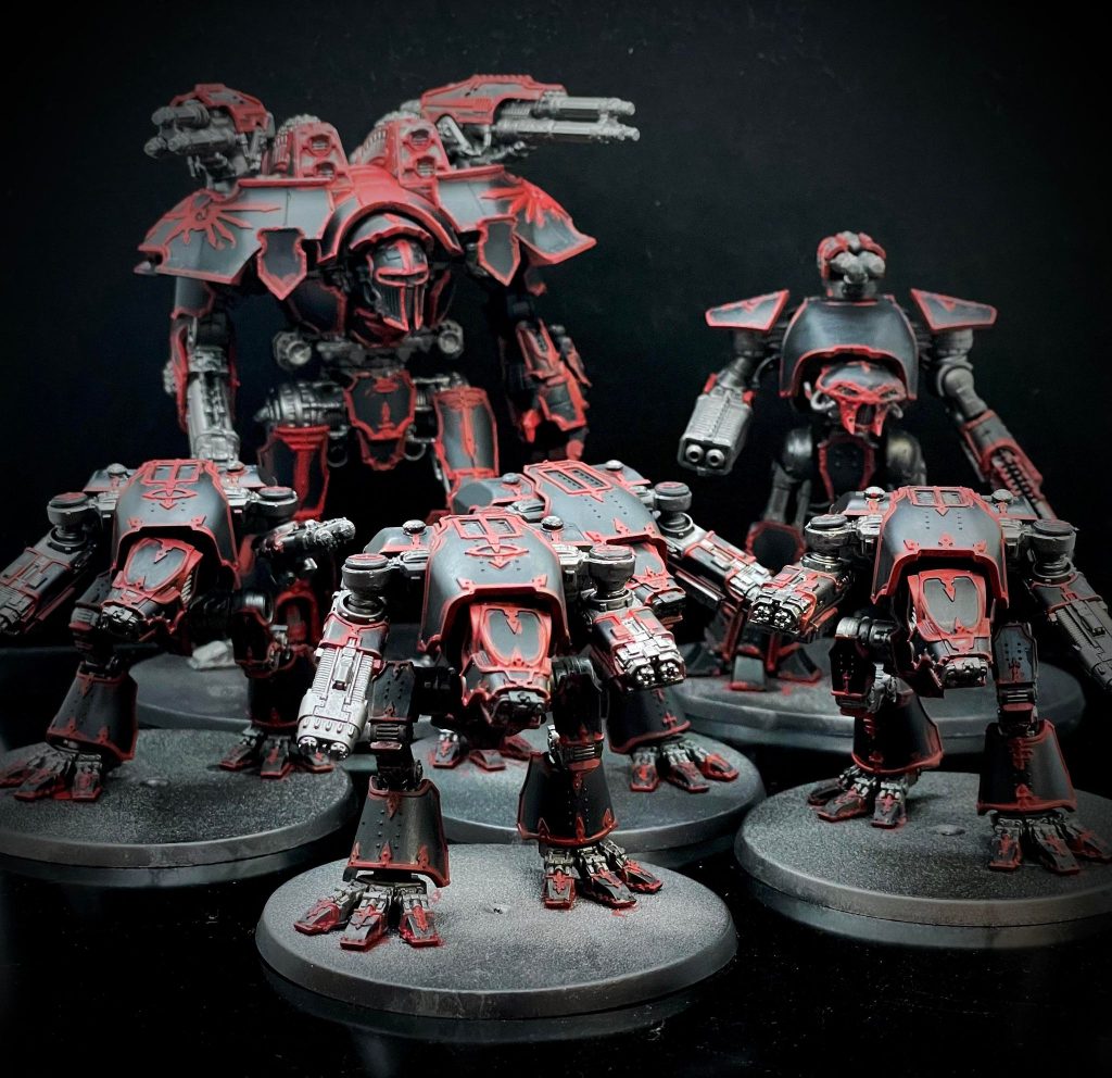 So much trim, so little timeDespite not being able to finish the battlegroup, I look forward to spending a little more time with these titans in the near future. I really like the Interfector scheme, the red and black is both striking and menacing. The one Reaver I painted last year as a test model for the scheme was my first real foray into freehand as well, and yeah flames on giant robots rips.