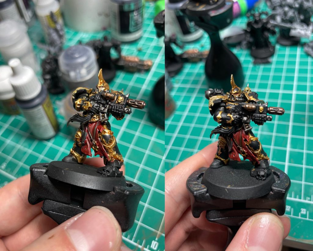 Here’s a quick pic of before and after a coat of Black Legion on one of the Chosen.