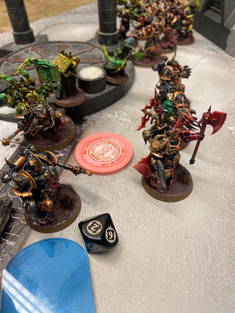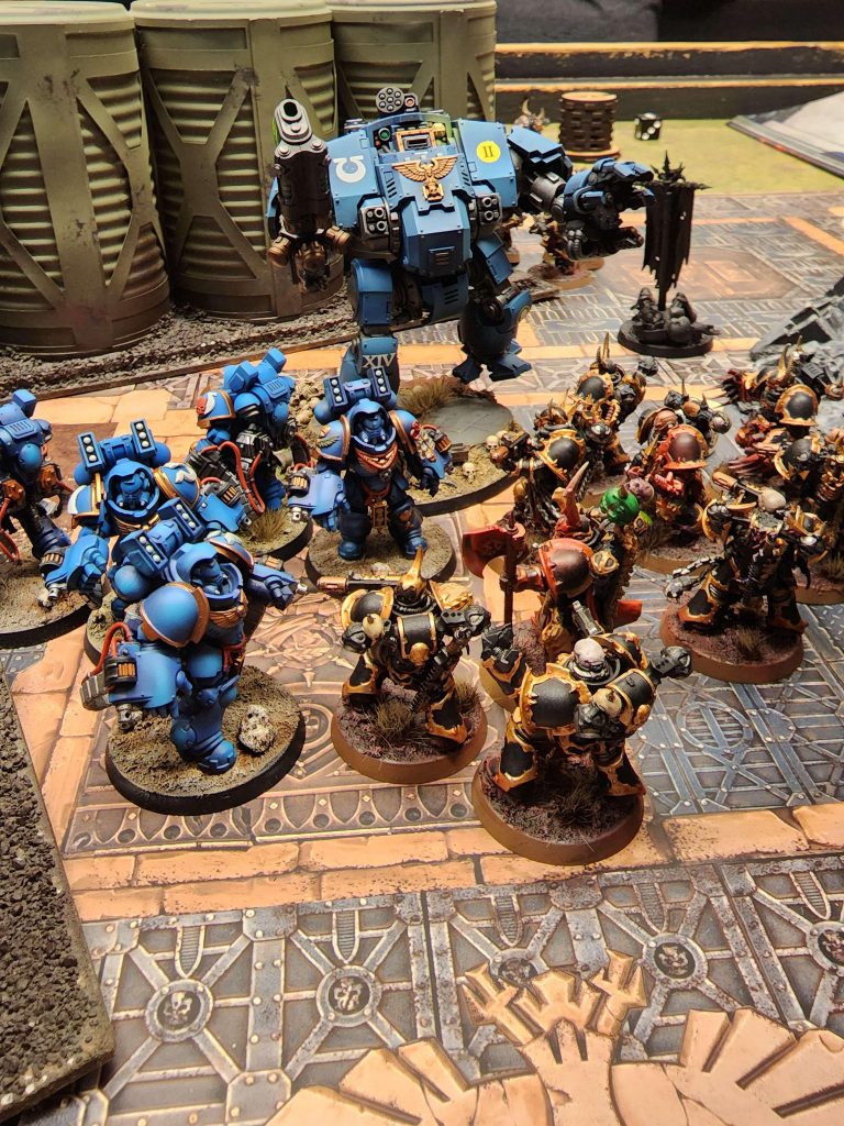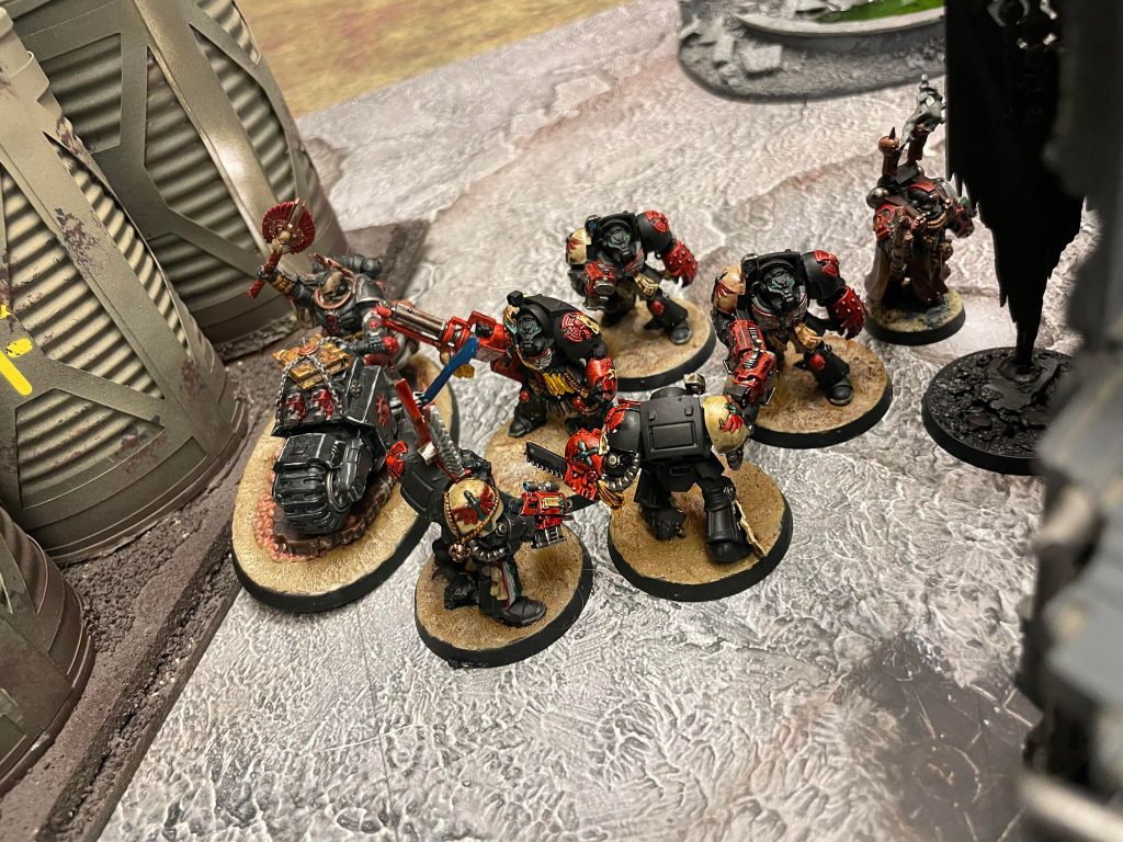 The Chosen survive the attacks from the Terminators, and they hold the line admirably as both the squads of Possessed I brought and Legionaries get to work trying to deal with the remaining terminators. The Legionaries get killed pretty quick and pick up a battle scar that they cant be targeted with stratagems, but the Posessed and Chosen eventually eat through the rest of the Terminators and Bike Chaplain.