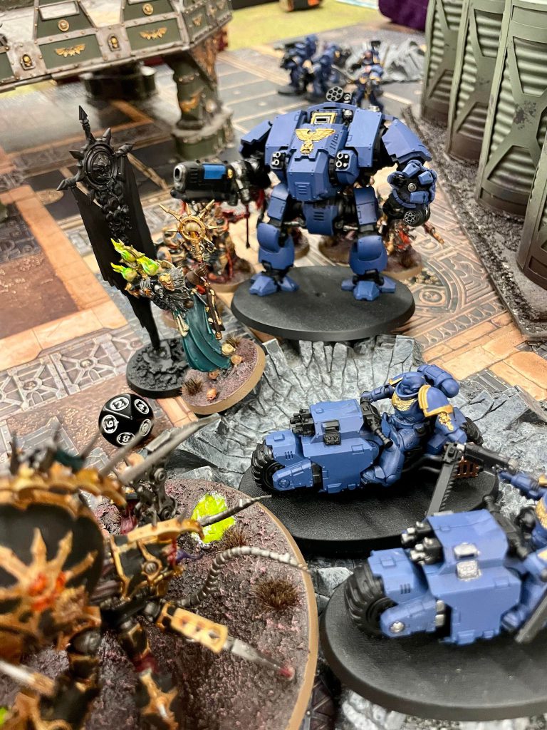 The rest of the game has us trading combat pieces to keep up the scoring. Sang Guard kill the Possessed, Malioch kills the Sang Guard, and the Librarian Dreadnaught would’ve killed Malioch too is I hadn’t gotten lucky and rolled well enough on the Dark Pact stratagem to bring Malioch back after dying on a 4+. What ends up really winning the game for me is the Legionaries, who move to control the south objective thanks to the fact they have obsec. The Terminators nearly kill the squad, but thanks to Illusory Supplication the Aspiring Champion survives and passes a morale check on turn five, then manages to fall back out of combat and hang onto the objective, pushing me ahead on points as the game ends.